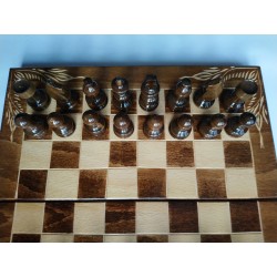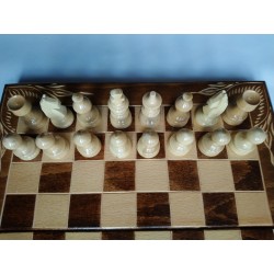 Ich präsentiere Ihnen ein sehr erschwingliches, brandneues, tolles Schachspiel, das komplett handgefertigt, handgeschnitzt, handgefertigt ist. Der Preis beinhaltet die Schachbox und 32 Teile, 30 Backgammon Stück, die in die Box passen. Die Schachfigur stammt aus Haselholz. Sie haben alle 2,4 cm Durchmesser an der Basis. Der Bauer ist 3,6 cm groß und der König ist 5,8 cm groß. Die Schachfiguren sind nicht gewichtet !!! Das Brett ist 32x32 cm. Die Stücke sind aus Haselnuss, und der Brettteil der Schachbox ist aus Buchenholz. Sie sind beide große Bäume für ein schönes Schach. Das Innere ist ohne Gehäuse. Das Schachbrett ist aus Buchenholz und hat eine ganz besondere traditionelle Blumenschnitzerei in allen 4 Ecken !!! Das macht es so besonders und anders! Um es interessanter und wertvoller zu machen, haben wir auch das Backgammonspiel im Schach gemacht. Viele Leute lieben Backgammon. Wer ist nicht so gut im Schach, es ist sicherlich großartig im Backgammon! Für noch mehr Spaß, wenn Sie die Schachbox auf der anderen Seite, anstelle von Schach, mit den Backgammon-Stücken drehen, können Sie Dame oder Entwürfe spielen! Jeder in der Familie kann spielen, was er will :) Grundsätzlich werden Sie 3 Spiele in 1 haben, alles handgefertigt, alles aus Holz, direkt vom Produzenten! Es ist handgefertigt, also bitte kleine Abweichungen akzeptieren! Es kann ein großes Geschenk sein, der Präfekt wählt für Ihr Kind, um es zur Schule zu bringen, zu ihren Freunden, um damit zu spielen. Schach ist wichtig für die Kinder und die gute intellektuelle Entwicklung aller.