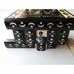 But… where is the keyhole?! It is where all boxes open, where they all have their lock, Now it is covered with one of the elements carved like a leaf or has some points. You slide down the middle one of them ( the middle of those 5,7 or 9 things depending on the box’s size) and there is the keyhole.