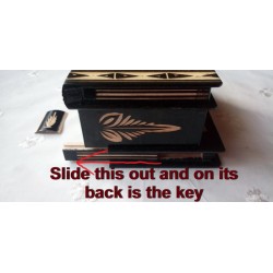 Pero ... ¿dónde está el ojo de la cerradura? Es donde se abren todas las cajas, donde todas tienen su candado, ahora está cubierto con uno de los elementos tallados como una hoja o tiene algunos puntos. Se desliza hacia abajo por el medio de ellos (el centro de esos 5,7 o 9 objetos dependiendo del tamaño de la caja) y allí está el ojo de la cerradura.