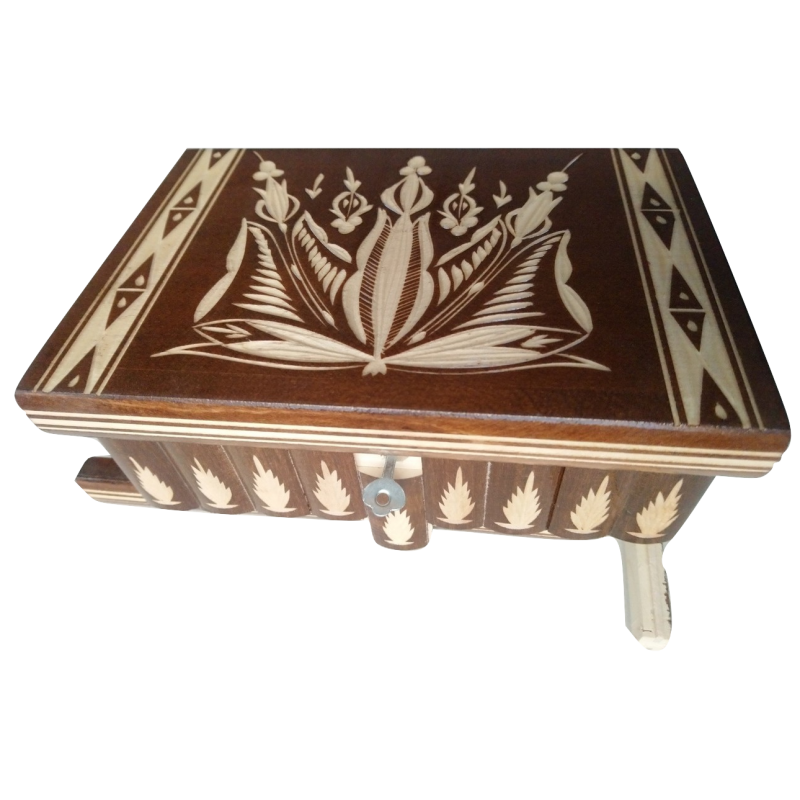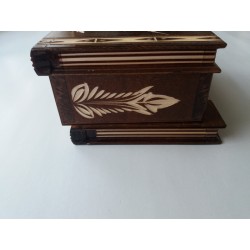 Tämä laatikko on kokonaan puusta (useimmiten vaahtera tai pyökki), ja se on kokonaan käsintehty ja käsityö lahjakkaalla käsikirjoittajalla. Se on lakattu, jolla on kiiltävä, sileä ja mukava näkökulma, ja pitkäikäiseen käyttöön.
