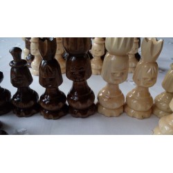Kaina nurodyta už šachmatų figūrėlių rinkinį, 16 rudų ir 16 natūralaus lakuoto medžio figūrėlių (2x16 vnt.).