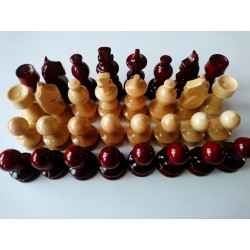 Sjakkfigurene er av hasseltre. De har alle 2,4 cm diameter i bunnen. Kongen er 5,7 cm høy. De er lakkert for å ha et skinnende, lyst og glatt utseende!