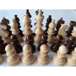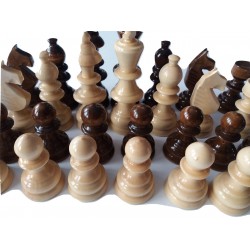 As figuras de xadrez são de madeira e têm uma cor castanho-noz. O peão tem 3,6 cm ou 1,41 polegadas de diâmetro na base e 6 cm ou 2,36 polegadas de altura e o rei tem 3,6 cm ou 1,57 de diâmetro na base e 11,5 cm.