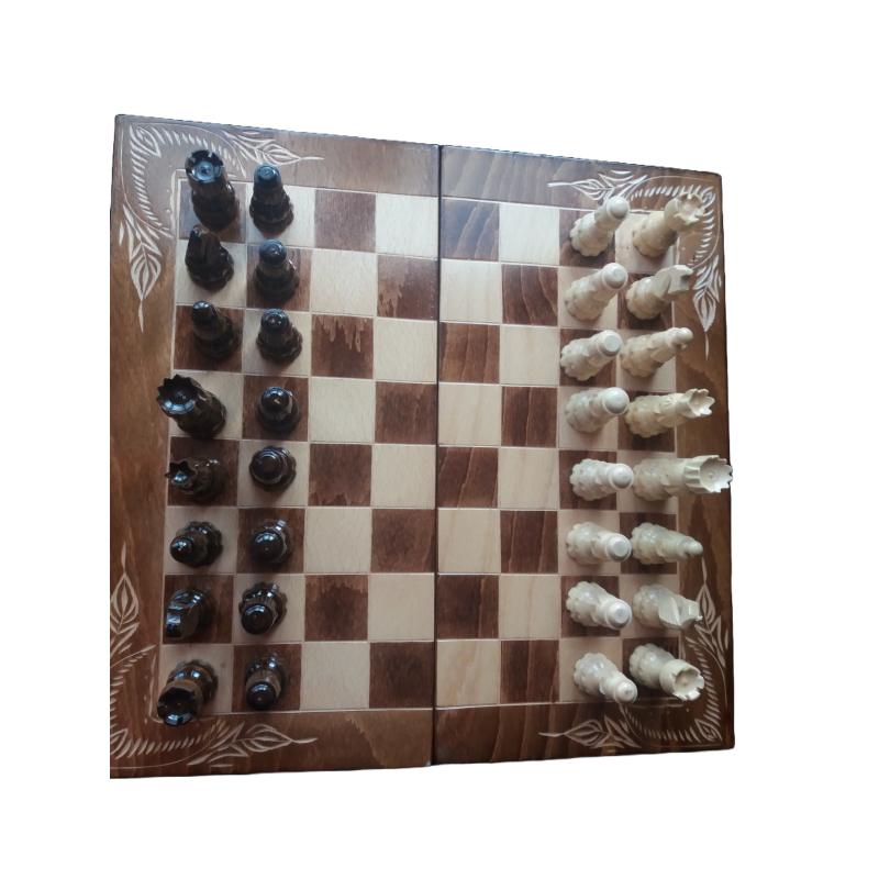 Predstavljam vam zelo ugoden, čisto nov, odličen komplet za šah, ki je v celoti ročno izdelan, ročno izrezljan, ročno izdelan. Cena vključuje šahovnico in 32 kosov, 30 kosov backgammon, ki se prilegajo v škatlo. Šahovska figura je iz lesa lešnika. Vsi imajo na dnu premer 3,2 cm. Peš je visok 4,6 cm, kralj pa 9 cm. Šahovnice niso obtežene!!! Plošča je 44x44 cm. Kosi so iz leske, deski del šahovnice pa iz bukovega lesa. Oba sta odlična drevesa za lep šah. Notranjost je brez ohišja. Šahovnica je iz bukovega lesa, v vseh 4 vogalih pa ima prav posebno tradicionalno rožnato rezbarjenje !!! Zaradi tega je tako poseben in drugačen! Da bi bilo bolj zanimivo in dragoceno, smo v šah izdelali tudi igro backgammon. Veliko ljudi obožuje backgammon. Kdor ni tako dober v šahu, je zagotovo odličen v backgammonu! Za še večjo zabavo, če šahovnico obrnete na drugo stran, lahko namesto šaha s figurami backgammon igrate dame ali skice! Vsak v družini lahko igra, kar mu je všeč :) V bistvu boste imeli 3 igre v 1, vse ročno izdelane, vse iz lesa, direktno od proizvajalca! Je ročno izdelan, zato prosimo, da upoštevate manjša odstopanja! Lahko je odlično darilo, prefekt se odloči, da ga vaš otrok odnese v šolo, svojim prijateljem, da se igrajo z njim. Šah je bistvenega pomena za otroke in dobro intelektualno evolucijo vseh.