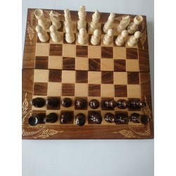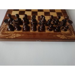 Predstavljam vam zelo ugoden, popolnoma nov, odličen šah, ki je v celoti ročno delo. Cena vključuje šahovnico in 32 figur, 30 figur za backgammon, ki sodijo v škatlo in dve kocki. Šahovske figure so iz leskovega lesa. Vsi imajo premer pri dnu 2,6 cm. Kmet je visok 4,6 cm, kralj pa 8 cm. Šahovnice niso obtežene!!! Tabla je 38x38 cm. Figurice so iz leske, ploščasti del šahovnice pa je iz bukovega lesa. Oba sta odlična drevesa za lep šah. Notranjost je brez ohišja. Šahovnica je iz bukovega lesa in ima v vseh 4 vogalih prav posebno tradicionalno ročno rezbarijo rožic !!! Zaradi tega je tako poseben in drugačen! Da bi bilo še bolj zanimivo in dragoceno, smo igro backgammon naredili tudi znotraj šaha. Veliko ljudi obožuje backgammon. Kdor ni tako dober v šahu, je zagotovo odličen v backgammonu! Za še več zabave, če šahovnico obrnete na drugo stran, lahko namesto šaha s figurami za backgammon igrate damo ali žogico! Vsak v družini lahko igra, kar hoče :) V bistvu boste imeli 3 igre v 1, vse ročno izdelane, vse iz lesa, neposredno od proizvajalca! Je ročno delo, zato sprejemamo manjša odstopanja! Lahko je odlično darilo, prefekt izbere, da ga vaš otrok odnese v šolo, svojim prijateljem, da se z njim igrajo. Šah je bistvenega pomena za otroke in dober intelektualni razvoj vseh.