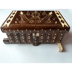 Denna låda är helt av trä (oftast lönn eller bokträ), och helt handgjord och handskuren av en begåvad handcrafter. Den är lackerad för att ha en blank, slät och fin aspekt, och för en långvarig användning.